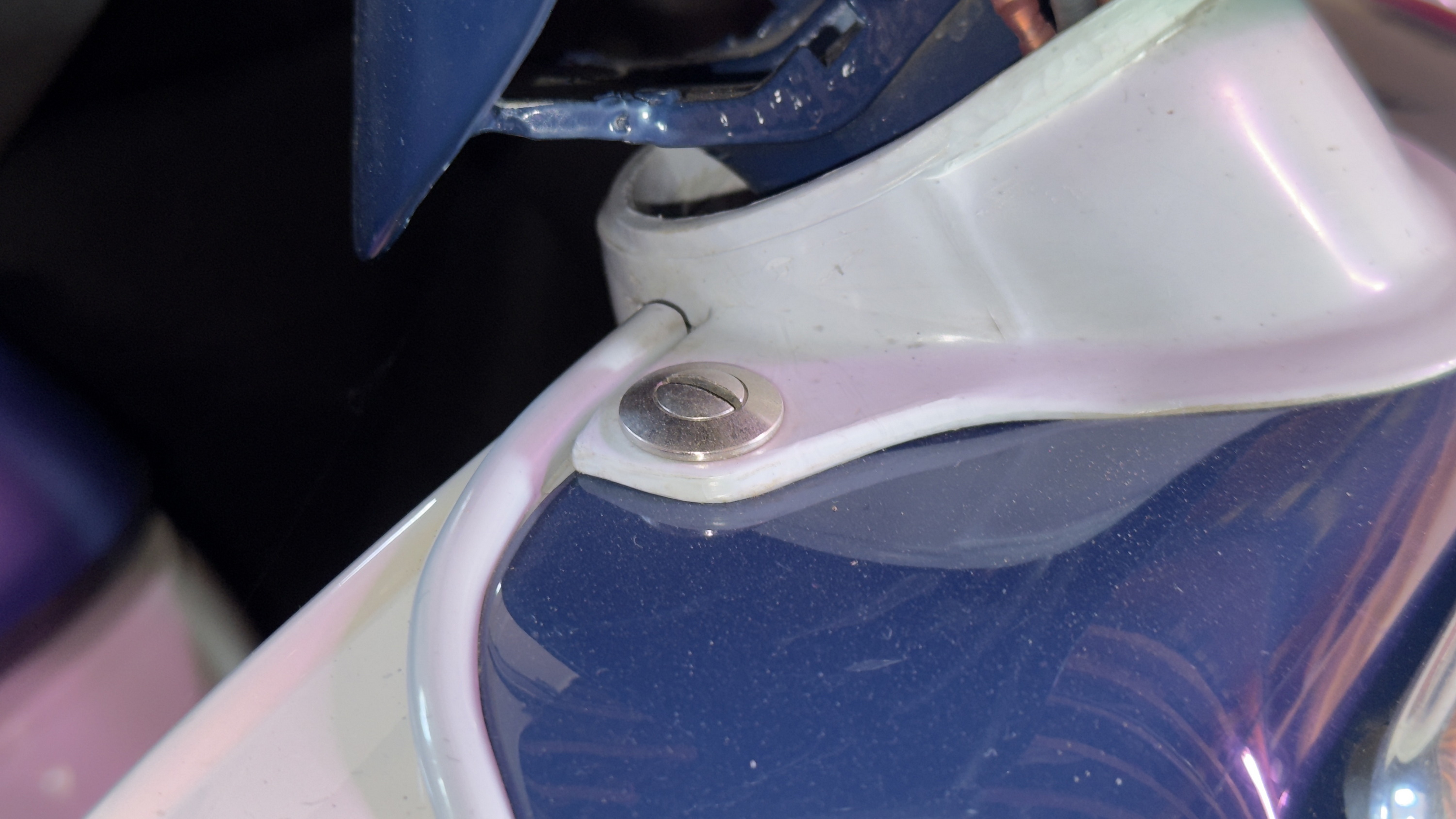 Die oberen beiden Löcher gehören zum Blinker, rechts die Bohrungen zu den (nicht serienmäßigen) Sturzbbügeln. Es befindet sich noch weiter unten eine Befestigung, wird auf den folgenden Bildern meines "gletscherblauen" vielleicht etwas deutlicher.