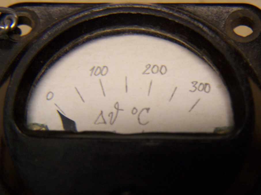 Das Foto ist lausig. Das interessante Instrument ist das Letzte rechts in der unteren Reihe. Reicht bis 300°C. Wenn du das genauer haben willst (...muß das sein?), könnte ich dir zum besagten Fe-Konstantan Thermoelement einen Messverstärker mit Linearisierung und Kompensation der Umgebungstemperatur entwerfen. Als Anzeige geht dann fast jedes beliebige Drehspulmesswerk, z.B ein Drehzahlmesser. Der hat eine 270° Skala. Da dürfte kein Auge mehr trocken bleiben... Skala muss man selbst malen.