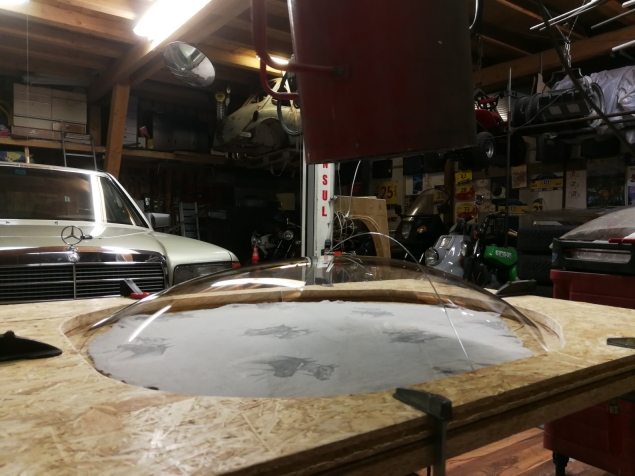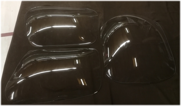 Die Lösung ist die Plexiglasscheibe in zwei genau auf die jeweilige Scheibe angefertigten Rahmen zu spannen und das erhitzte Material mit Druckluft in die gewünschte Form zu blasen. Es erfordert viel Fingerspitzengefühl für Temperaturverteilung und Druckverhältnisse aber mir etwas Erfahrung wird’s perfekt.