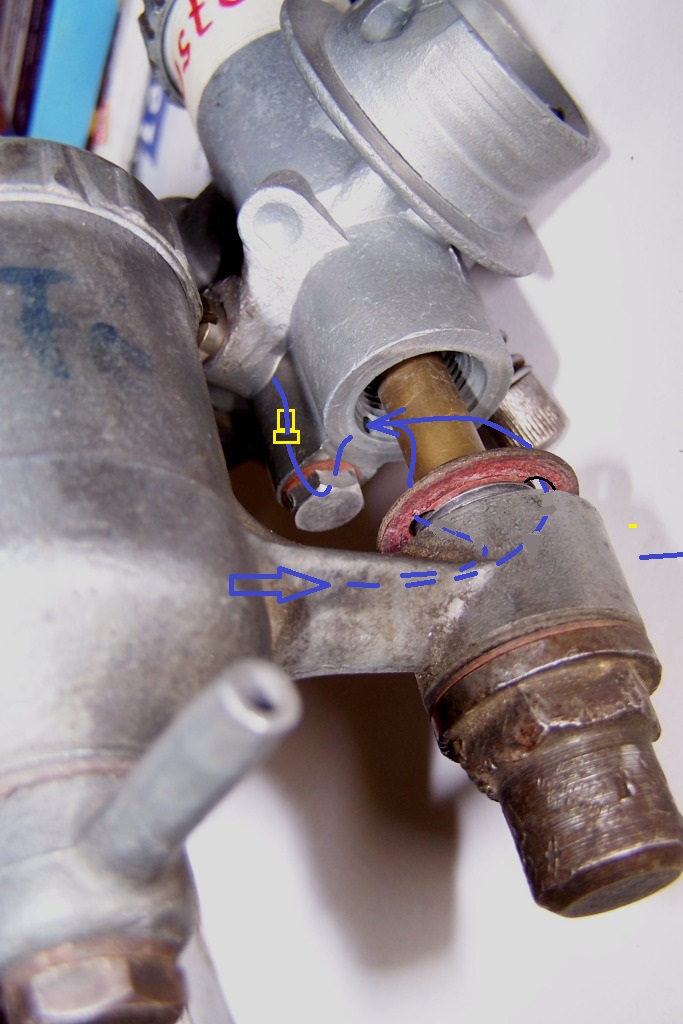 am Gewinde vorbei zur Leerlaufdüse (gelb) gelangt