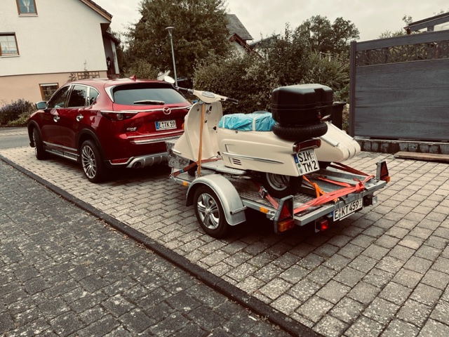 Ich habe meinen Motorradanhänger so umgebaut, dass ich auch das Gespann mitnehmen kann. Im Urlaub beispielsweise hinter dem Wohnmobil.