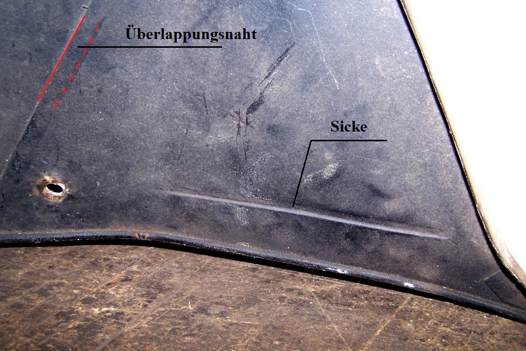 Der Spengler hat die Sicken auf der Außenseite der beiden Seitenteile der Vorderhaube, wo die geraden Dreiecke mit dem Pressteil der Haube verschweißt sind, sichtbar gelassen und sagt, er würde das nicht zuspachteln, das wäre auch im Original sichtbar. Ich kenne das nur zugespachtelt.