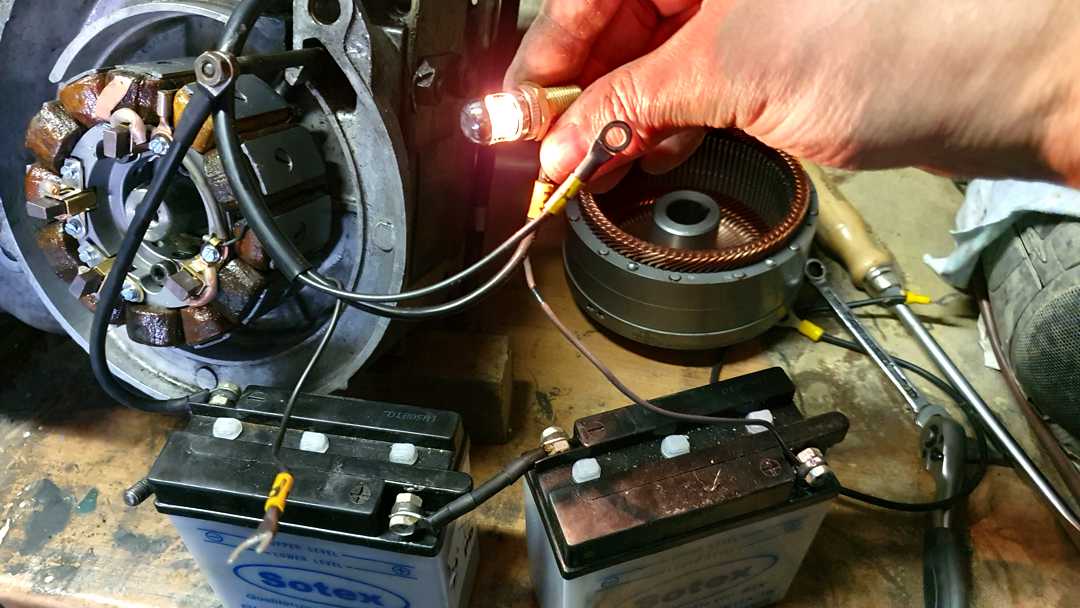 Ich würde jetzt den Stator nochmals ausbauen und das gleich mit der Glühlampe probieren. Musst dann halt den Minus am Statoreisen befestigen.