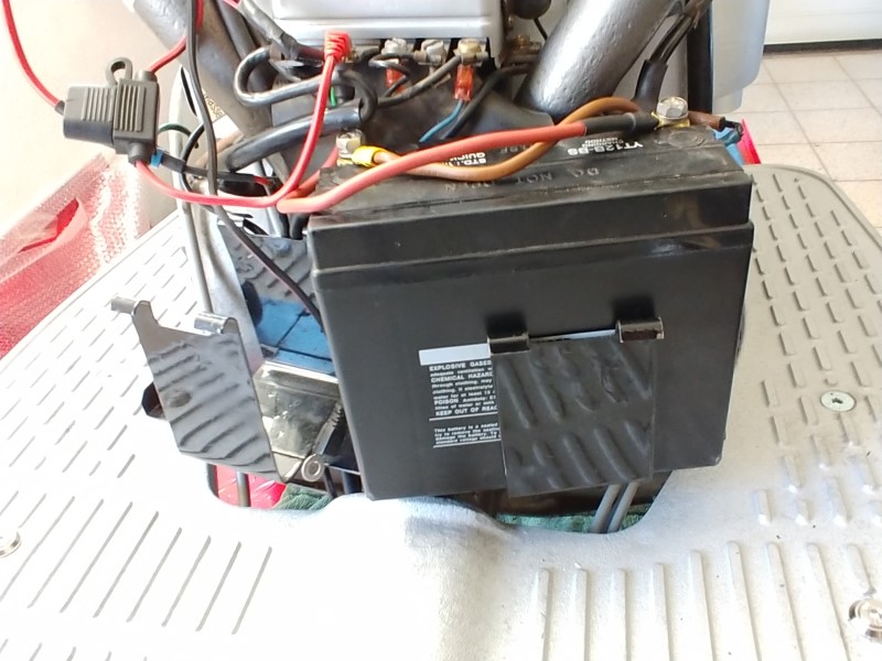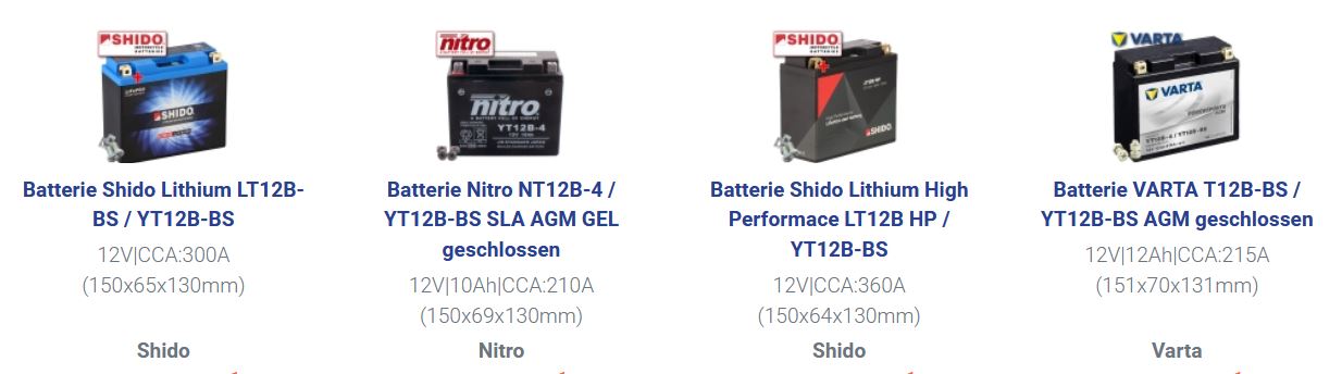 Ich habe den originalen 103A1-Halter verwendet. Hierzu die beiden inneren Laschen nach unten gebogen (ebener Boden) und eine YT12B-BS von YUASA (AGM, 12V, 10Ah, CCA=210A; Abmessungen 150x69x130) eingebaut. Passt gut rein und keine Probleme.