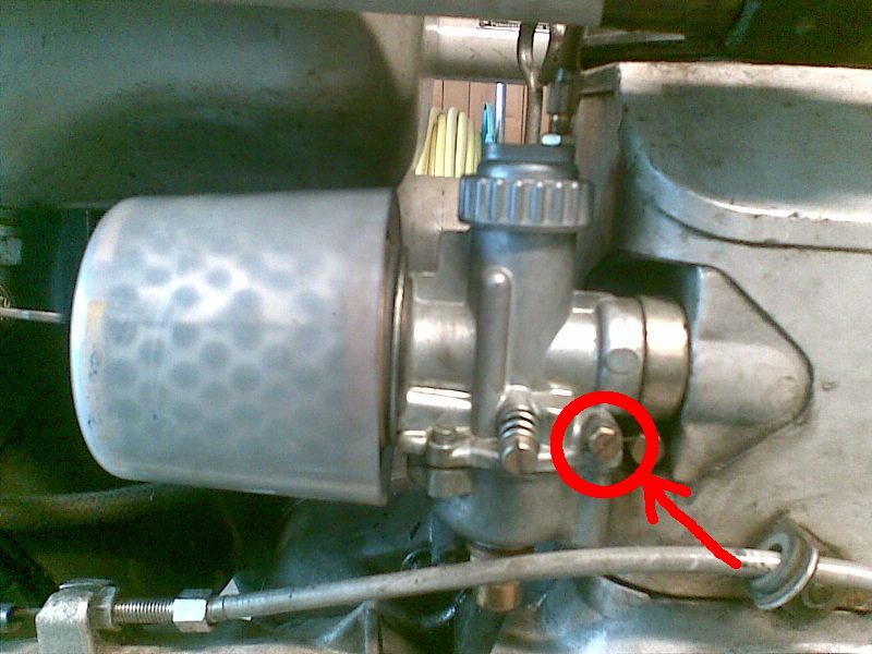 Der Vollständigkeit halber noch die Frage: welchen Vergaser hast Du denn verbaut? Ich habe am A1 einen 22er Bing "Clubvergaser" und hatte dort eine Undichtigkeit an der im anhängenden Bild gekennzeichneten Schraube. Ich denke jedoch, dass es kaum eine solche Kleinigkeit sein kann - scheint sich bei Dir ja schon um eine nennenswerte Menge Nebenluft zu handeln.