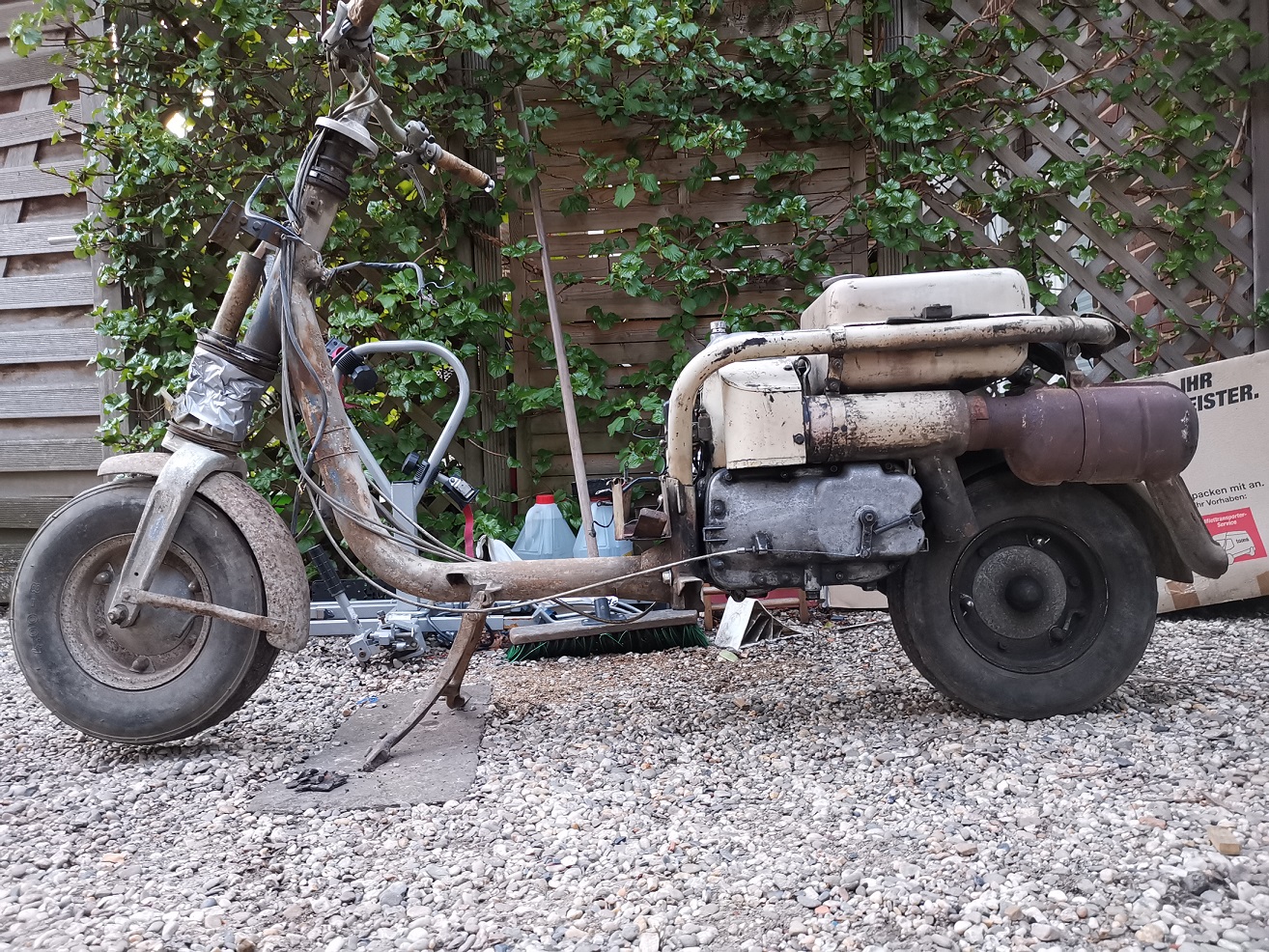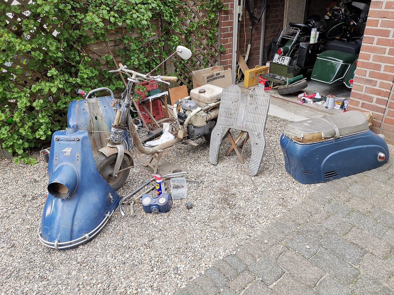 Auf jeden Fall ist für den Neuling doch erstaunlich, wie wenig vom Roller übrigbleibt wenn man das Blech wegnimmt. Vielleicht hat die falsche Vergaserklappe sich 1959 eingefunden, aus dem Jahr liegt mir eine Schätzungsurkunde der deutschen Automobil-Treuhand vor. Könnte ja ein Unfall mit Wiederaufbau gewesen sein. Ich werde nach Fertigstellung versuchen, von den Kindern des Erstbesitzers Informationen zu erhalten.