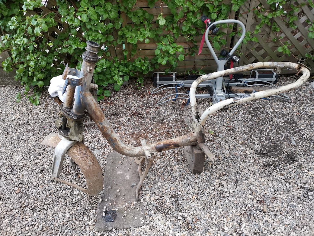 Der Rahmen selber ist von Motorhalterung nach vorne leider fast völlig von Lack befreit und mit der braunen Pest verschönert. Im Moment schwanke ich noch zwischen selber aufarbeiten oder komplett pulverbeschichten lassen.