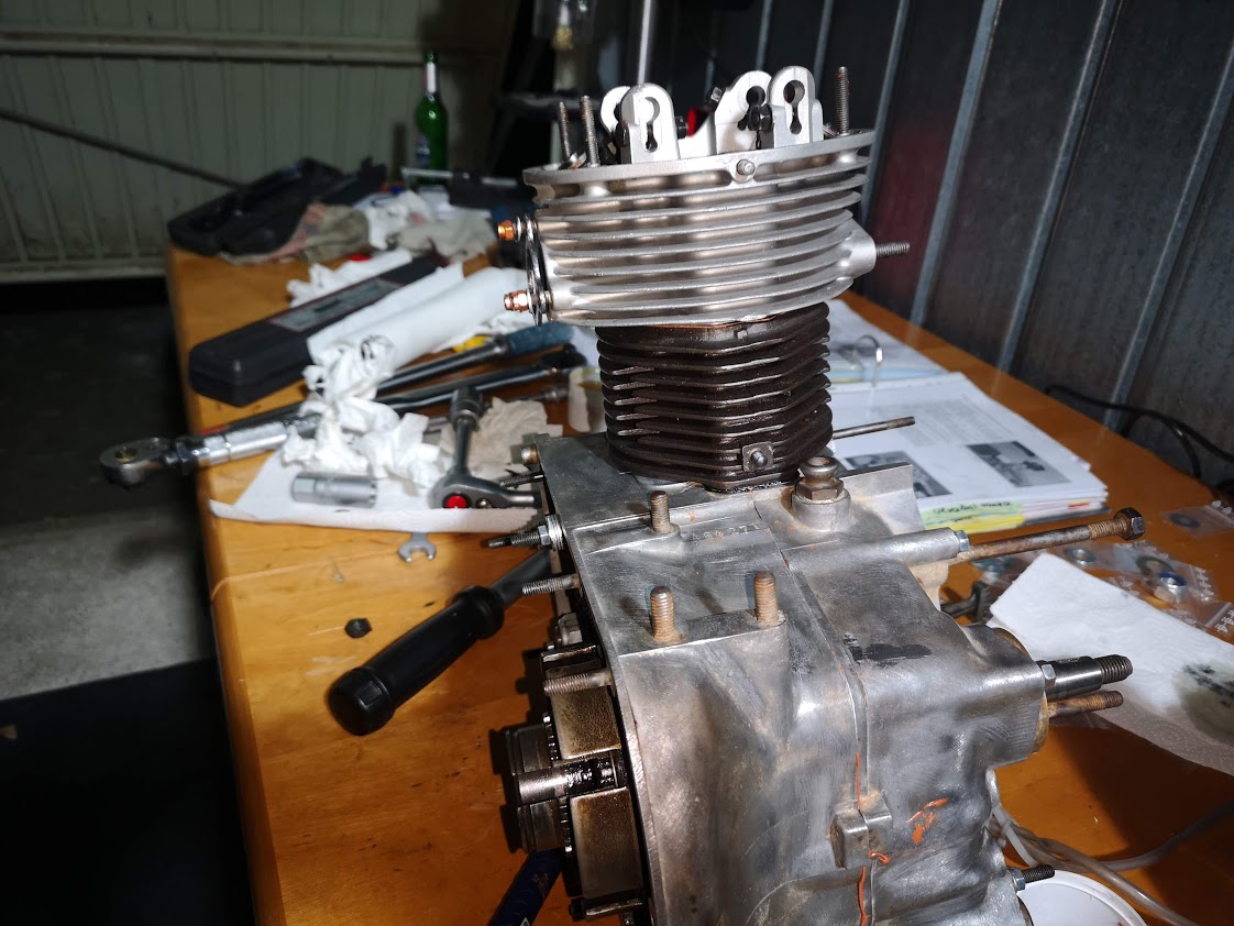 Nun also Fussdichtung eingelegt, war ich stolz das ich die verdrehten(jeweils 120°) Kolbenringe samt Kolben dank eines super Werkzeug von Heinkelbernd in den Zylinder bekommen habe. Meine tolle Kupferdichtung eingelegt und den Kopf drauf. Das Einlassventil vom Kopf(überholter Kopf, gebraucht gekauft) musste ich nochmal nachschleifen, da es minimal undicht war.
