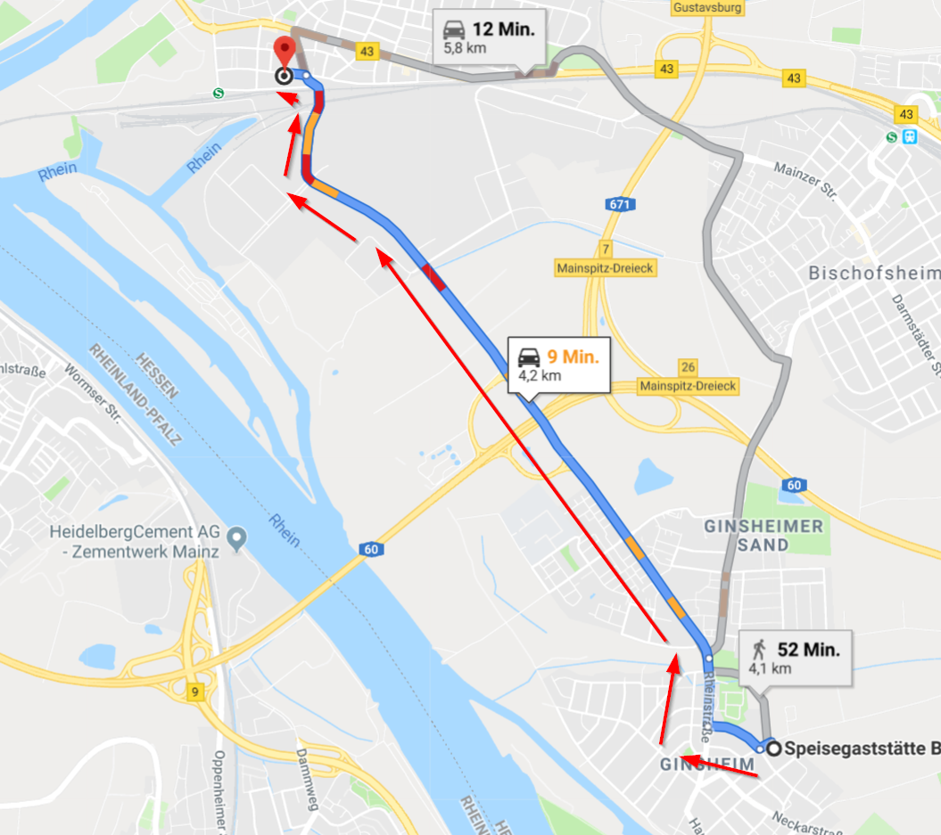 Hier der Plan vom Bürgerhaus Ginsheim zum Bürgerhaus Gustavsburg.