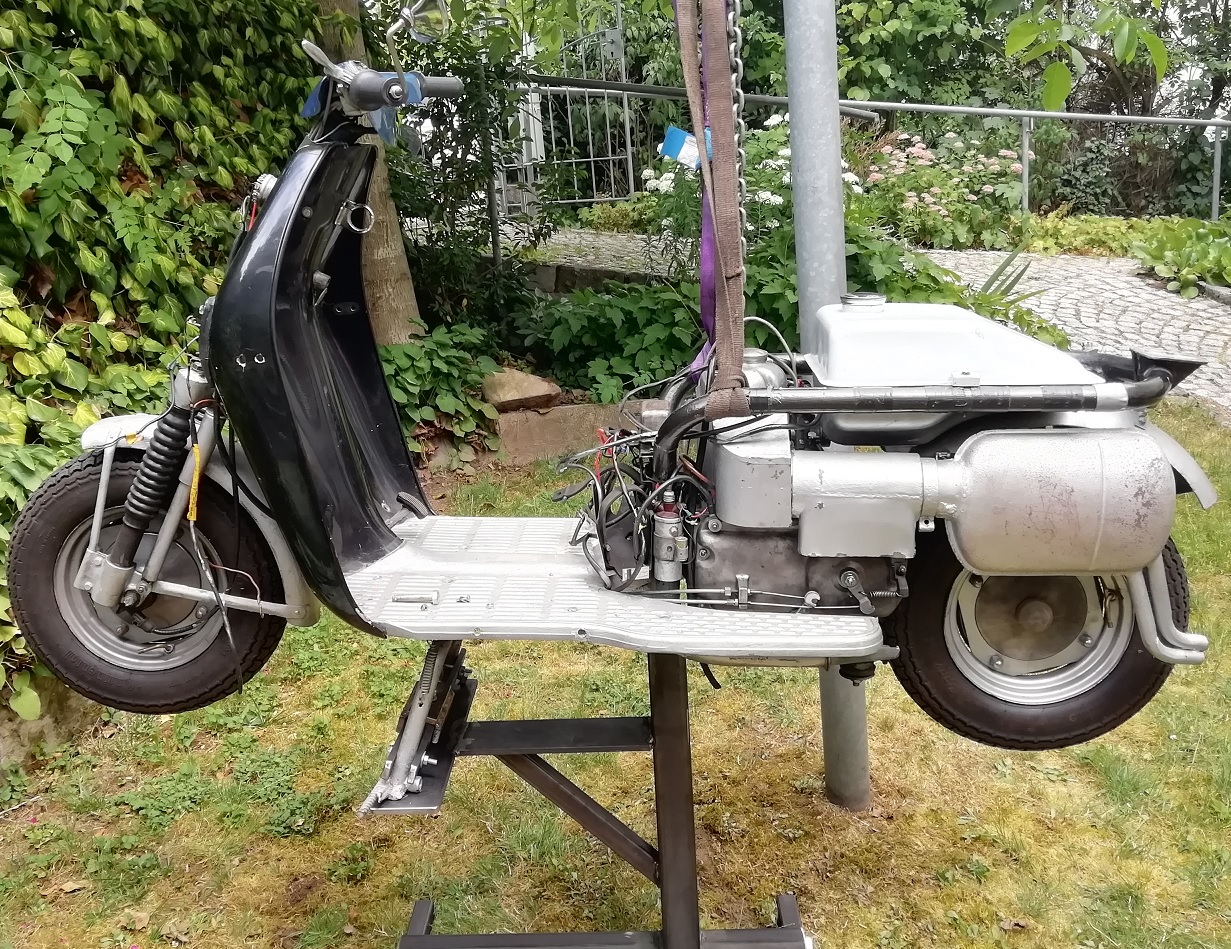Suche Rollermontagebock, Motormontagebock habe ich. Werde dann die Maße von Seite 52 nehmen und den Rest improvisieren, nur hätte mich interessiert wozu die Schelle teile 12, 13, 14 ist.