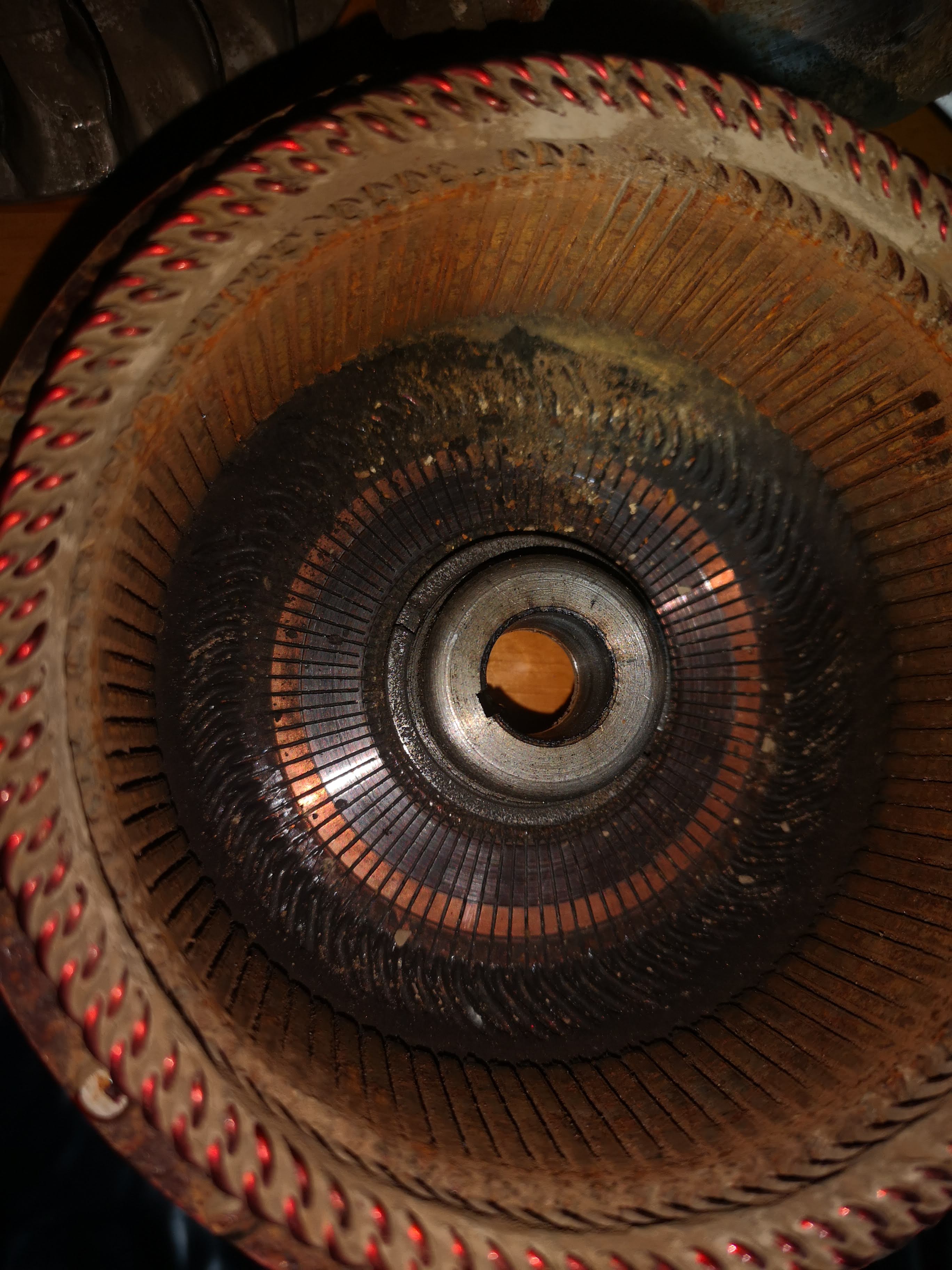 Die Kohlen waren noch nicht komplett runter....trotzdem sieht die Kollektorfläche etwas mitgenommen aus. Beziehungsweise die Messing-Farbe ist teilweise abgeschabt....Aber die Zwischenräume sind noch vorhanden.........Die Kollektorfläche besitzt jetzt auch keine tiefen Riefen.....