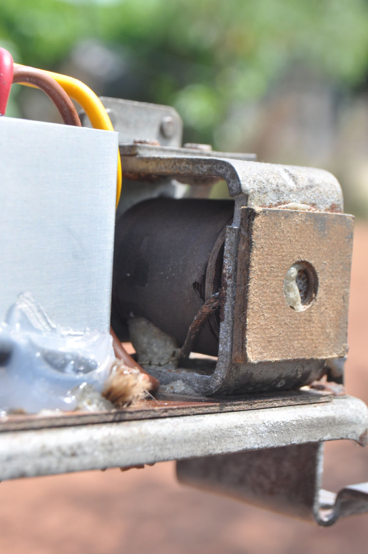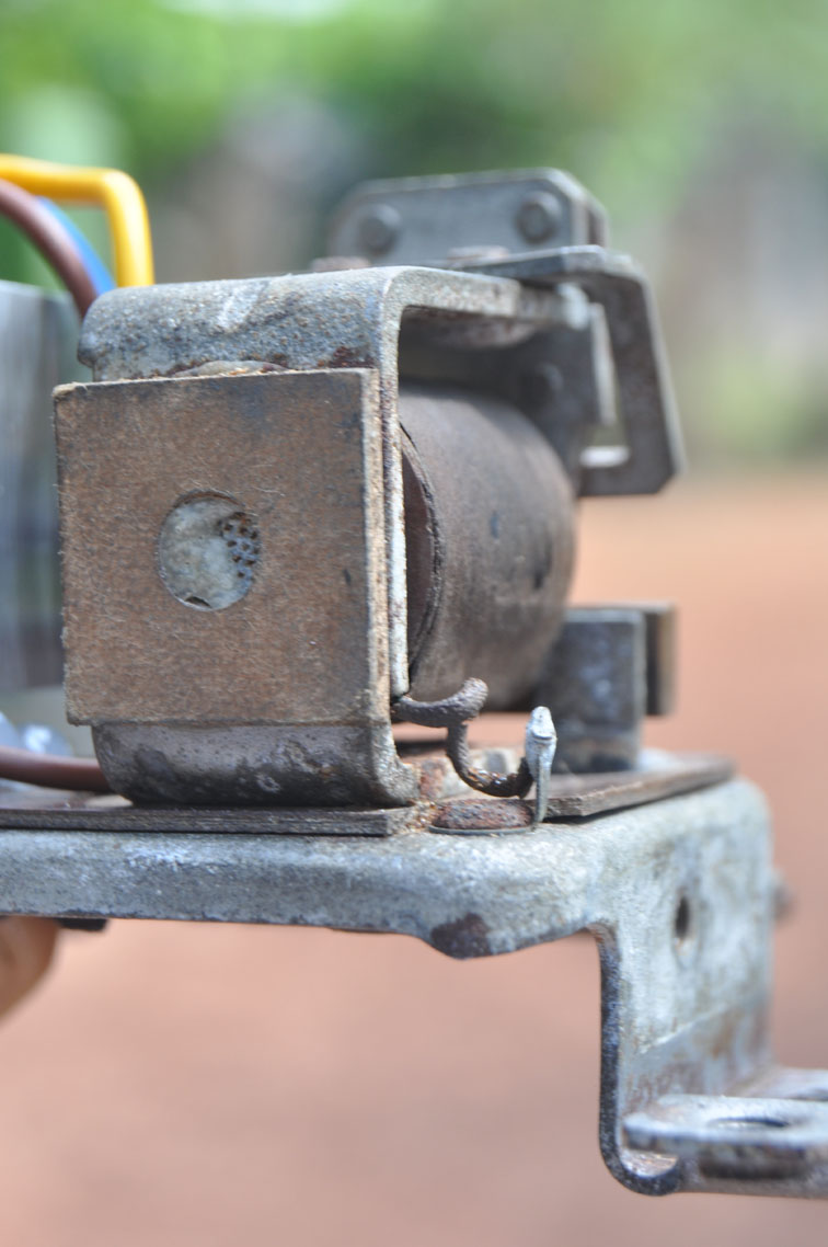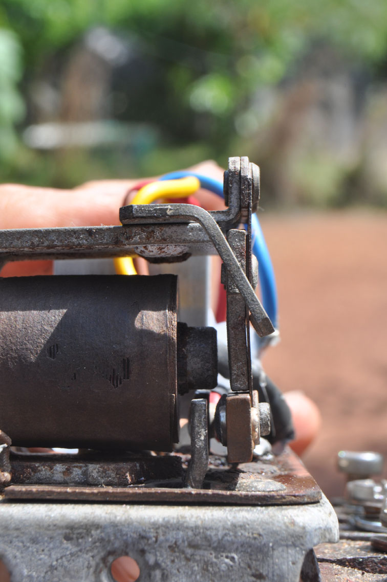 Ich habe den mit der Elektronik versehenen Regler wieder eingebaut, dann den Deckel abgenommen und beobachtet, was passiert. Offensichtlich wird die Spule nicht vom Strom durchflossen und der Kern nicht magnetisiert, denn die Kontaktbruecke bewegt sich nicht. Der Trick mit dem breiten Schraubenzieher funkltionierte sofort, ich koennte das ja als einzige Moeglichkeit zum Starten beibehalten, dann klaut wenigstens niemand das Fahrzeug, aber vielleicht koennt ihr mir noch eine elegantere Loesung empfehlen.