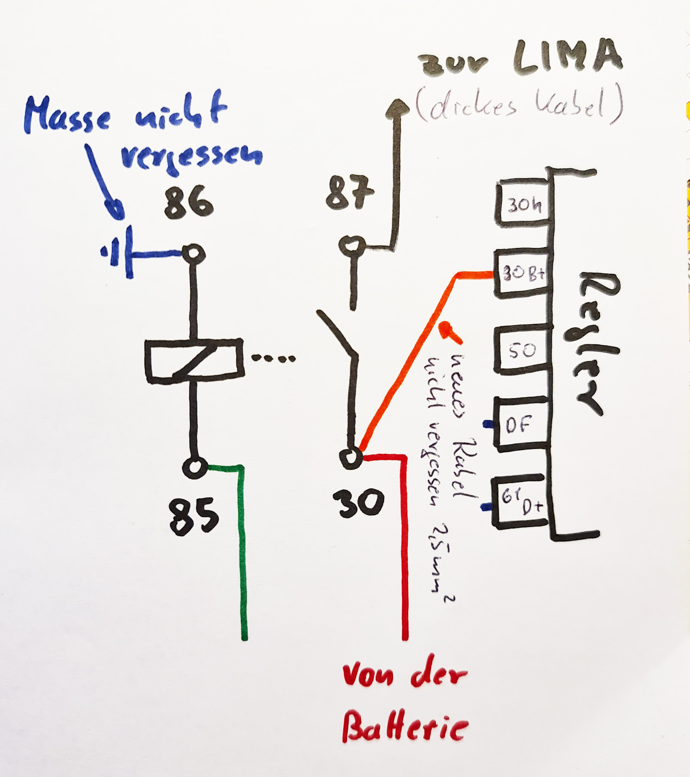 Das dickste LIMA-Kabel vom Regler (30h) auf 87 am neuen Relais umklemmen.